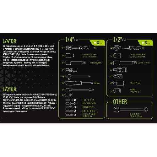 Набір інструментів Alloid 1/4″ і 1/2″ 82 предмети підходить для обслуговування автомобілів, складання та ремонту механізмів, виконання слюсарних і монтажних робіт. Наявність двох популярних розмірів приєднувального квадрата дозволяє працювати як з дрібними кріпленнями, так і з більш навантаженими вузлами.