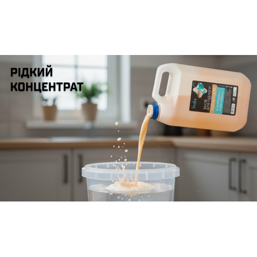 • Розведіть концентрат у теплій воді згідно з рекомендаціями на упаковці (зазвичай 30–50 мл засобу на 5 літрів води).