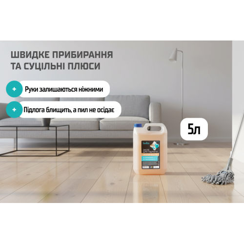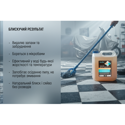 Після миття підлога виглядає доглянутою, блискучою та надовго зберігає чистоту.