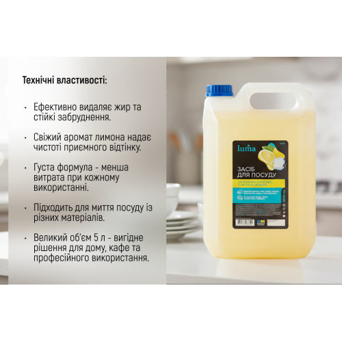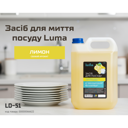 Засіб для миття посуду Luma «Лимон» 5 л — вигідне рішення для дому, кафе та професійної кухні. Він ефективно розчиняє жир, стійкі забруднення й залишає посуд сяючо чистим та ароматним.