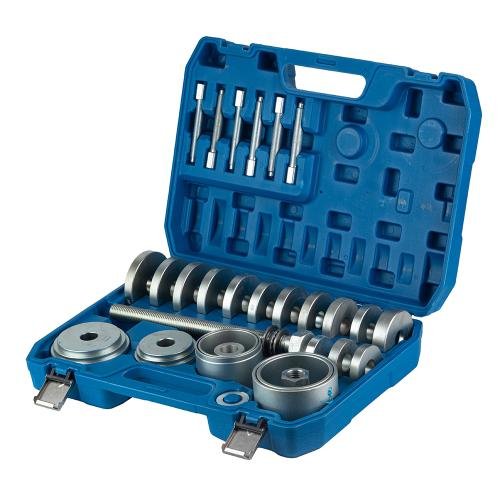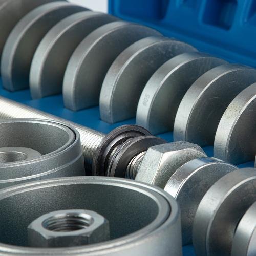 Комплект включає 31 високоточну деталь — оправки, плити, болти, гайки, направляючі втулки — усе, що потрібно для безпечної роботи з маточинними підшипниками без пошкоджень. Зберігається в міцному кейсі.